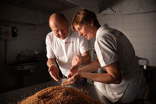 Im Chiemgau backen wir unsere beliebten Keimbrote nach einem ganzheitlichen Ansatz, der auf gesunden, biodynamisch bewirtschafteten Böden basiert. Unser Team verwendet ein spezielles Backverfahren mit gekeimtem Getreide, das in aufbereitetem Wasser zum Keimen gebracht, anschließend verarbeitet und bei niedriger Temperatur gebacken wird. Dieser Prozess fördert die Produktion von Enzymen, verbessert die Nährstoffaufnahme, die Verdaulichkeit und erhöht den Gehalt an Proteinen, Ballaststoffen, Vitaminen und Mineralstoffen im Getreide, wobei gekeimtes Getreide bis zu 15 % mehr Protein enthält als nicht-gekeimtes.