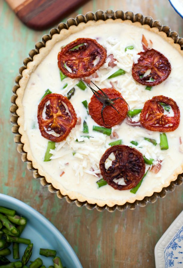 Frühlingsquiche mit grünem Spargel, gerösteten Tomaten & würzigem Cheddar