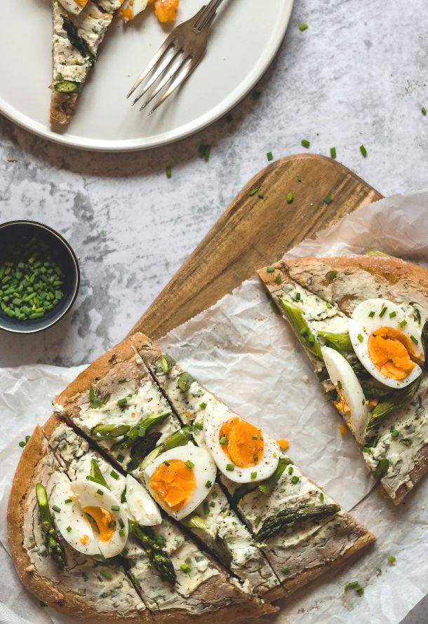 Frühlings-Fladen mit cremigem Belag, grünem Spargel & Eiern